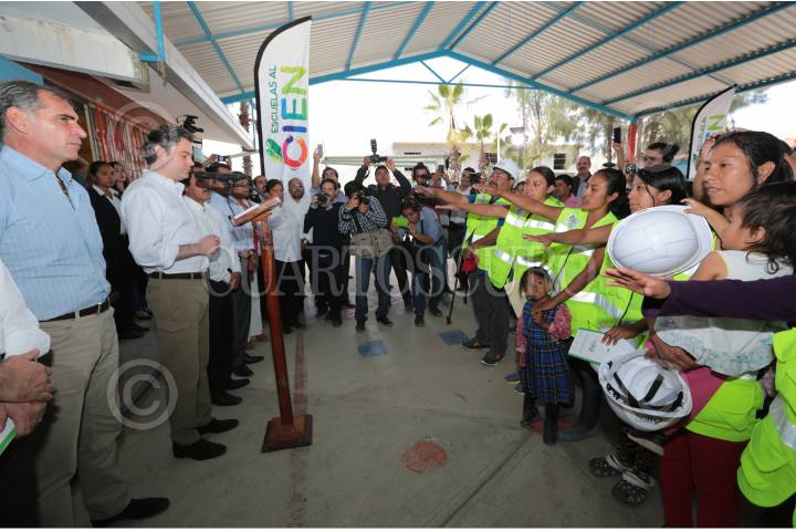 MIAHUATLÁN, OAXACA, 22FEBRERO2016.- Al poner en marcha el programa Escuela al CIEN, Aurelio Nuño Mayer, secretario de Educación Pública, dijo que hay disposición de diálogo con la sección 22 sindical, pero no para limitar la Reforma Educativa ni violar la ley, y pidió también apertura a la disidencia magisterial. En la Escuela Primaria Rural Emiliano Zapata, dialogó con maestros de esta comunidad, a quienes dijo que los profesores oaxaqueños que no se han evaluado tendrán otra oportunidad para presentar la Evaluación del Desempeño. Anuncia más de 2 mil millones de pesos para infraestructura escolar en Oaxaca. Lo acompaño el gobernador de la entidad Gabino Cué Monteagudo. FOTO: SEP /CUARTOSCURO.COM