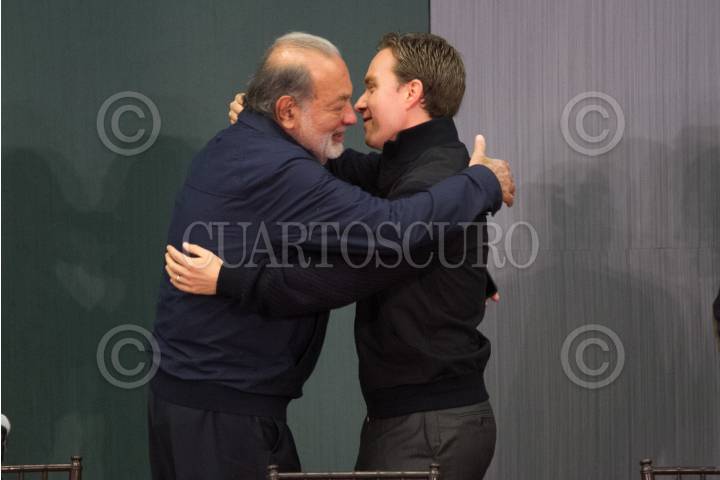 CIUDAD DE MÉXICO, 07NOVIEMBRE2017.- Carlos Slim Helú, fundador del Grupo Carso, y Manuel Velasco Coello, gobernador de Chiapas, durante la presentación del informe de participación del sector privado en la etapa de reconstrucción tras los sismos del 7 y 19 de septiembre que afecto miles de casas en el Estado de México, Chiapas, Veracruz, Oaxaca, Morelos, Puebla y Ciudad de México. FOTO: MOISÉS PABLO /CUARTOSCURO.COM