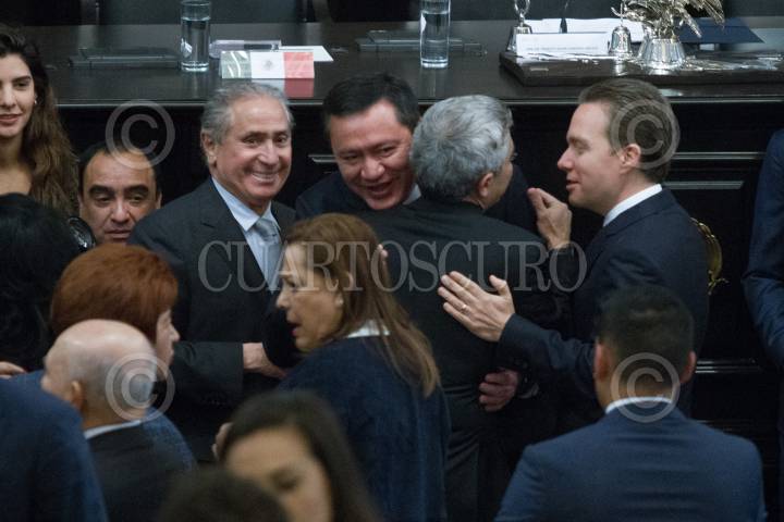 CIUDAD DE MÉXICO, 06DICIEMBRE2017.- El senador del PRI, Joel Ayala Almeida; Miguel Ángel Osorio Chong, secretario de Gobernación; Miguel Ángel Mancera, Jefe de Gobierno, y Manuel Velasco Coello, gobernador de Chiapas, durante la ceremonia de entrega de la medalla Belisario Domínguez, en la vieja casona de Xicoténcatl. FOTO: MOISÉS PABLO /CUARTOSCURO.COM