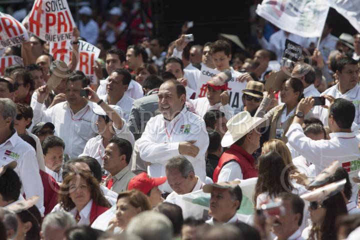 CIUDAD DE MÉXICO, 18MARZO2018.- Quirino Ordaz Coppel, gobernador de Sinaloa, y Miguel Riquelme, gobernador de Coahuila, durante el mitin en el que José Antonio Meade Kuribreña, candidato a la Presidencia de la República por la coalición "Todo por México", se registró oficialmente ante el INE y así para poder competir en las próximas elecciones de julio. FOTO: MOISÉS PABLO /CUARTOSCURO.COM