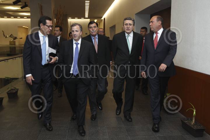 MÉXICO, D.F., 16JUNIO2015.- El canciller José Antonio Meade Kuribreña encabezó este martes la reunión entre funcionarios de la Secretaría de Relaciones Exteriores (SRE) con la Comisión Ejecutiva de Derechos Humanos de la Conferencia Nacional de Gobernadores (CONAGO). Durante el encuentro, se analizó la mecánica de trabajo para la resoluución de casos en el Sistema Interamericano de Derechos Humanos y la situación de los derechos humanos en las entidades federativas. En la imagen Roberto Campa, subsecretario de Derechos Humanos; el canciller José Antonio Meade; Mariano González Zarur, gobernador de Tlaxcala; Luis Raúl González, presidente de la Comisión Nacional de Derechos Humanos y Rubén Moreira, gobernador de Coahuila. FOTO: SRE /CUARTOSCURO.COM