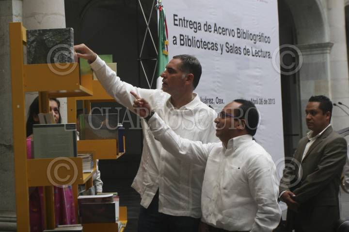 OAXACA, OAXACA, 06ABRIL2013.- El gobernador de Oaxaca, Gabino Cué encabezó en el patio central del Palacio de Gobierno la entrega de Acervo Bibliográfico a Bibliotecas Públicas y Salas de Lectura de Oaxaca. Al concluir el evento el mandatario afirmó que la presencia de la Policía Federal en Oaxaca por ahora no es necesaria, pues el accionar de la Sección 22 del SNTE no ha afectado a terceros y se ha mantenido en el marco de la ley. FOTO: ARTURO PÉREZ ALFONSO /CUARTOSCURO.COM