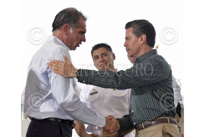 SALINA CRUZ, OAXACA, 02ENERO2015.- En el inicio de sus actividades públicas en 2015, el Presidente Enrique Peña Nieto anunció la construcción de 22 embarcaciones para Pemex en los astilleros de este puerto, con una inversión de 4 mil millones de pesos, y señaló que el Gobierno de la República está comprometido a asegurar que todas las acciones, todas las políticas públicas de orden social en materia de infraestructura que se están impulsando, impacten y beneficien a las familias mexicanas. En la imagen el priista saluda a el gobernador de Oaxaca Gabino Cue. FOTO: PRESIDENCIA /CUARTOSCURO.COM
