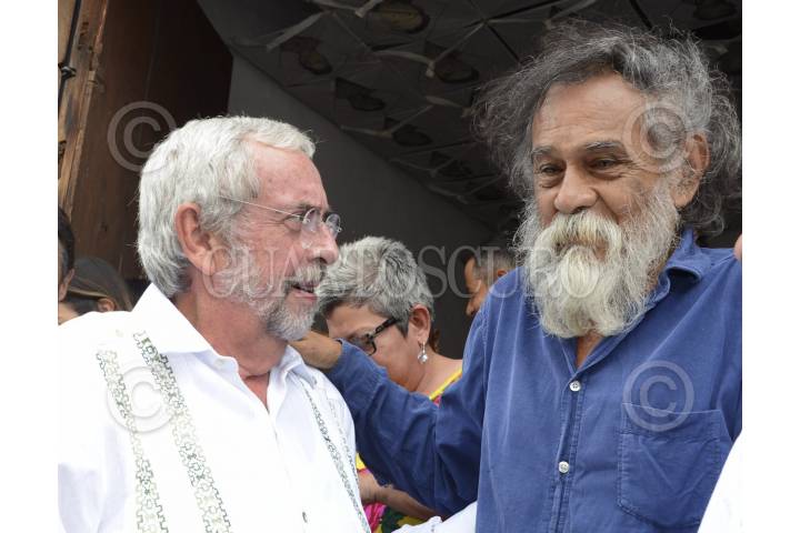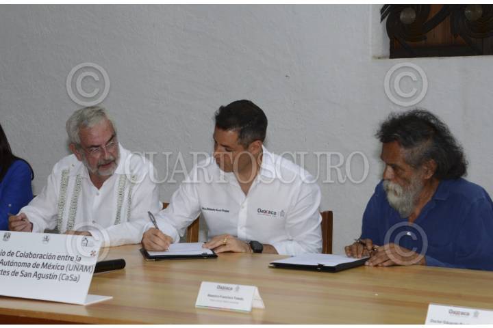 OAXACA, OAXACA, 03JULIO2017.- El rector Enrique Graue Wiechers; el gobernador de Oaxaca, Alejandro Murat Hinojosa, y el artista plástico Francisco Toledo signaron un convenio de colaboración entre la UNAM y el Centro de las Artes de San Agustín, en el Instituto de Artes Gráficas de Oaxaca, que fomentará la movilidad de académicos y estudiantes, así como programas de servicio social para rescatar y preservar la riqueza cultural y artística de la entidad. FOTO: UNAM /CUARTOSCURO.COM