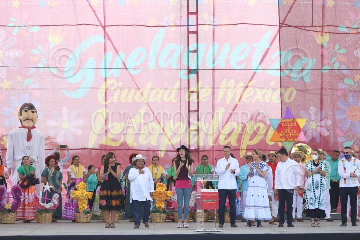 La secretaría de cultura de la CDMX, Claudia Stella Curiel y el gobernador del estado de Oaxaca Alejandro Murat durante la presentación de la Guelaguetza en la Ciudad de México, celebrando su 90 aniversario como una expresión cultural que identifica al Estado de Oaxaca, en el Cerro de la Estrella de la alcaldía Iztapalapa.
