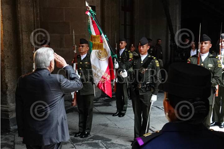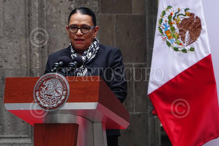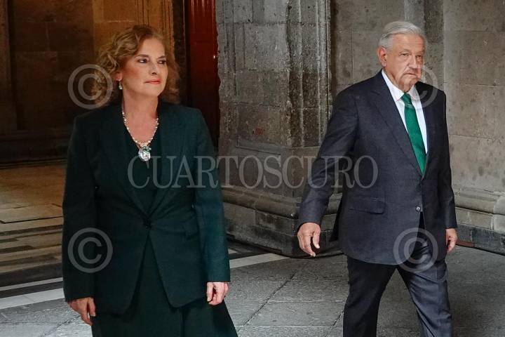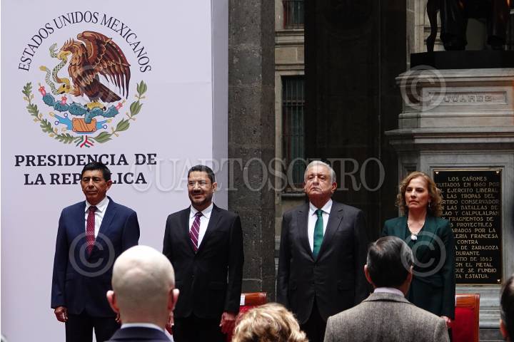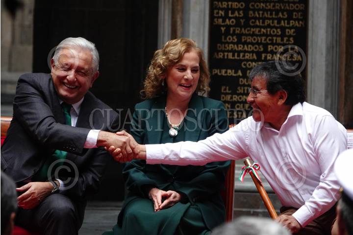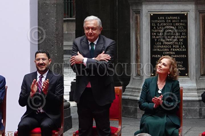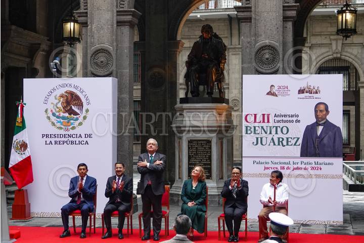 CIUDAD DE MÉXICO, 18JULIO2024.- Andrés Manuel López Obrador, presidente de México, Beatriz Muller, esposa del mandatario, Salomón Jara, gobernador de Oaxaca, Martí Batres, jefe de gobierno, Rosa Icela, Secretaria de Seguridad y Protección Ciudadana, Isaias García, presidente municipal de Gelatao, Oaxaca, durante el CLII Aniversario Luctuoso de Benito Juárez, en el Patio Mariano de Palacio Nacional. FOTO: ROGELIO MORALES /CUARTOSCURO.COM