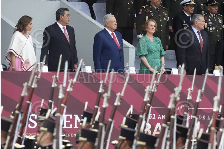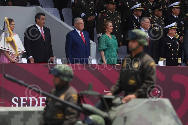 Gabriela Bonilla; Sergio Salomón, gobernador de Puebla; el presidente Andrés Manuel López Obrador; Beatriz Gutiérrez Müller, Adán Augusto López, secretario de gobernación y el Almirante José Rafael Ojeda Durán, Secretaría de Marina durante el desfile cívico militar como parte de la ceremonia conmemorativa al 161 Aniversario de la “Batalla de Puebla del 5 de mayo de 1862”, en el Mausoleo del “General Ignacio Zaragoza”, en la ciudad de Puebla.