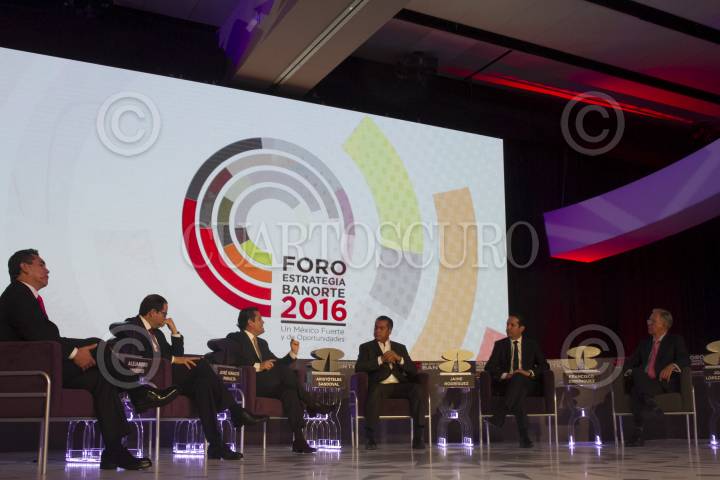 CIUDAD DE MÉXICO, 24AGOSTO2016.- Alejandro Moreno, gobernador de Campeche; José Ignacio Peralta, gobernador de San Luis Potosí; Aristóteles Sandoval, gobernador de Jalisco; Jaime Rodríguez, gobernador de Nuevo Léon; Francisco Domínguez, gobernador de Querétaro, y el periodista Joaquín López-Dóriga, durante el Foro Estrategia Banorte 2016 "Un México fuerte y de oportunidades", realizado en un hotel del centro de la capital. FOTO: MOISÉS PABLO /CUARTOSCURO.COM