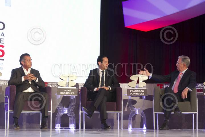 CIUDAD DE MÉXICO, 24AGOSTO2016.- Jaime Rodríguez, gobernador de Nuevo Léon; Francisco Domínguez, gobernador de Querétaro, y el periodista Joaquín López-Dóriga, durante el Foro Estrategia Banorte 2016 "Un México fuerte y de oportunidades", realizado en un hotel del centro de la capital. FOTO: MOISÉS PABLO /CUARTOSCURO.COM