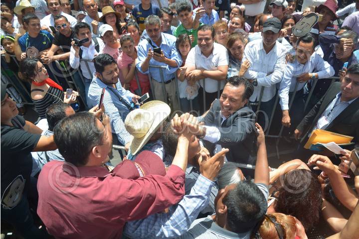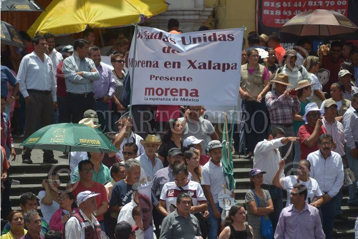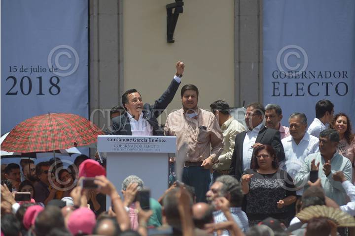 XALAPA, VERACRUZ, 15JULIO2018.- Cuitláhuac García Jiménez emite su primer mensaje como gobernador electo de Veracruz, esto en la plaza Sebastián Lerdo de la capital del estado ante militantes y simpatizantes de MORENA. FOTO: ALBERTO ROA /CUARTOSCURO.COM