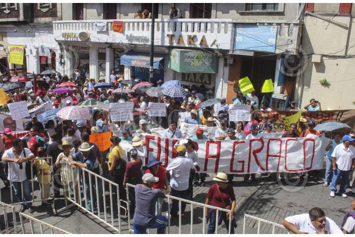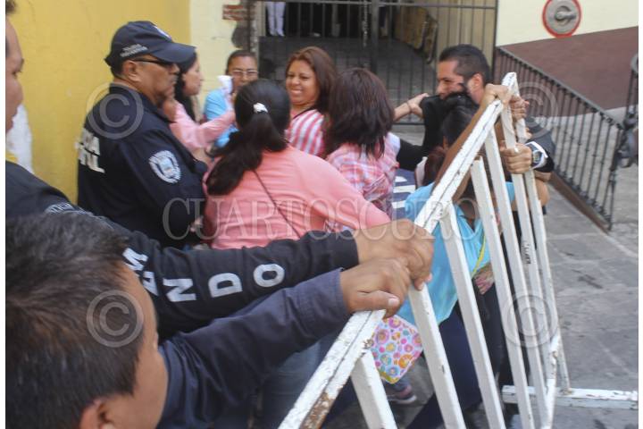 CUERNAVACA, MORELOS, 01SEPTIEMBRE2015.- Ciudadanos de diferentes organizaciones civiles y campesinas cerraron las principales calles del centro para exigir al congreso del estado un juicio político al gobernador Graco Ramirez. Los manifestantes cerraron por unas horas los accesos al edificio, rompieron un vidrio, por lo que fueron agredidos por guardias de seguridad con dióxido de carbono. Los hechos ocurrieron durante la sesión solemne de instalación de la Quincuagésima Tercera Legislatura y apertura del primer período ordinario de sesiones del primer año de ejercicio constitucional. FOTO: PATRICIA MORALES /CUARTOSCURO. COM