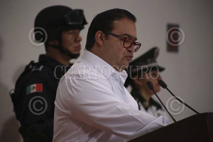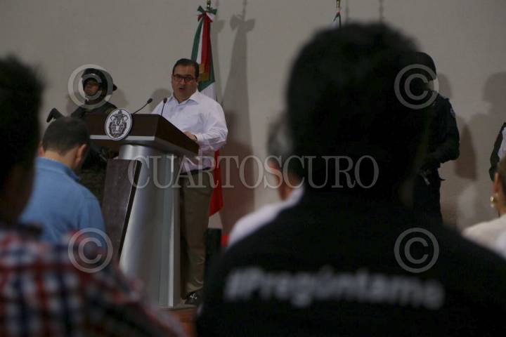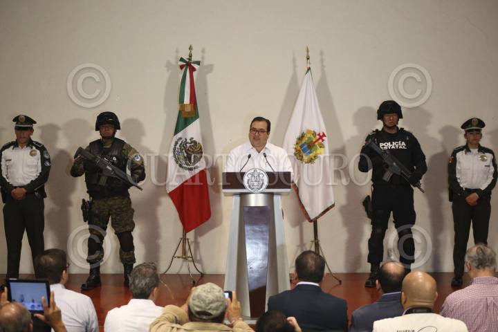 BOCA DEL RÍO, VERACRUZ, 15FEBRERO2016.- El gobernador de Veracruz, Javier Duarte de Ochoa ofreció una rueda de prensa donde mencionó a todos los supuestos delincuentes que se han atrapado o finado hasta el momento; afirmó que la autoridad no está rebasada por la delincuencia y que el actual Secretario de seguridad, Arturo Bermúdez no va a ser cambiado. FOTO: ILSE HUESCA /CUARTOSCURO.COM