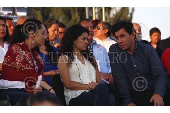 Claudia Sheinbaum, jefa de Gobierno, coordinador general de Comunicación Social y Vocero del Gobierno de México, Jesús Ramírez Cuevas y la secretaria del trabajo y previsión social, Luisa Maria Alcalde Luján durante el primer informe de Gobierno de Clara Brugrada Molina en Iztapalapa