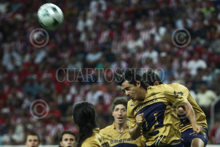 ZAPOPAN, JALISCO, 12MAYO2011.- Juan Carlos Cacho de los Pumas de la UNAM, intenta rematar el balón durante el encuentro en contra de las Chivas del Guadalajara; partido de ida de las semifinales del futbol mexicano del torneo Clausura 2011 que se realizó en el estadio Omnilife y finalizo empatado a 1 gol. FOTO: RODOLFO ANGULO/CUARTOSCURO.COM