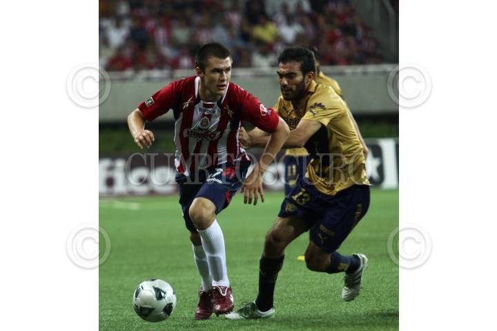 ZAPOPAN, JALISCO, 12MAYO2011.- Omar Arellano de las Chivas del Guadalajara pelea el balón durante el encuentro en contra de los Pumas de la UNAM; partido de ida de las semifinales del futbol mexicano del torneo Clausura 2011 que se realizó en el estadio Omnilife y quedo empatado a 1 gol. FOTO: RODOLFO ANGULO/CUARTOSCURO.COM
