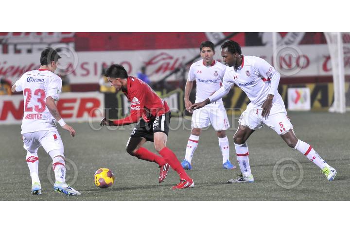 TIJUANA, BAJA CALIFORNIA, 30NOVIEMBRE2012.- Anoche los Xolos de Tijuana derrotaron 2-1 al Toluca en el partido de ida de la final de la Liga MX. Joe Corona quitándose la marca de Wilson Taigo y Edgar Benitez. FOTO: RAMÓN BLANCO /SEMANARIO ZETA /CUARTOSCURO.COM