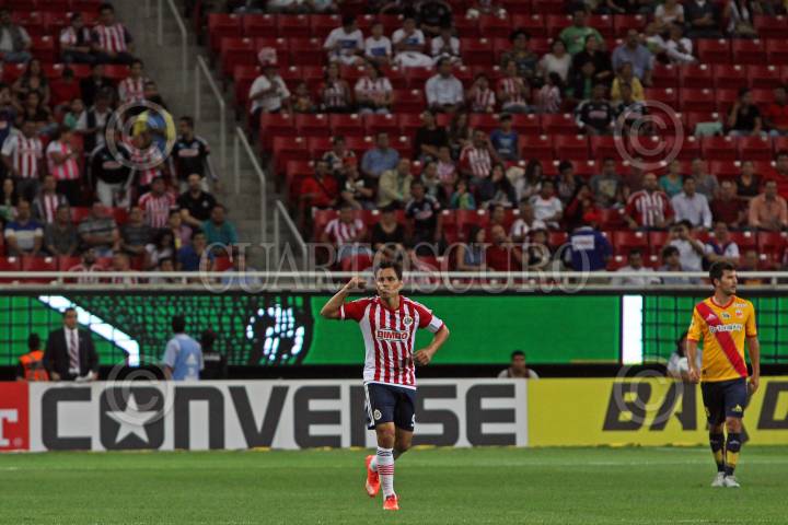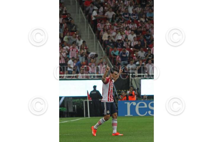 ZAPOPAN, JALISCO. 12AGOSTO2015.- El jugador de Chivas, Omar Bravo celebra uno de sus goles, esto en partido correspondiente a la Jornada 4 del Torneo Apertura 2015 de la Liga MX, en donde se enfrentan los equipos de las Chivas de Guadalajara frente a Monarcas Morelia, en partido que se lleva a cabo en el Estadio Omnilife. FOTO: FERNANDO CARRANZA GARCIA/ CUARTOSCURO.COM