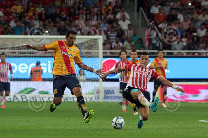 ZAPOPAN, JALISCO. 12AGOSTO2015.- El jugador de Chivas, Carlos Salcedo, disputa un balón frente al contrario de Monarcas Cristian Pellerano, esto en partido correspondiente a la Jornada 4 del Torneo Apertura 2015 de la Liga MX, en donde se enfrentan los equipos de las Chivas de Guadalajara frente a Monarcas Morelia, en partido que se lleva a cabo en el Estadio Omnilife. FOTO: FERNANDO CARRANZA GARCIA/ CUARTOSCURO.COM