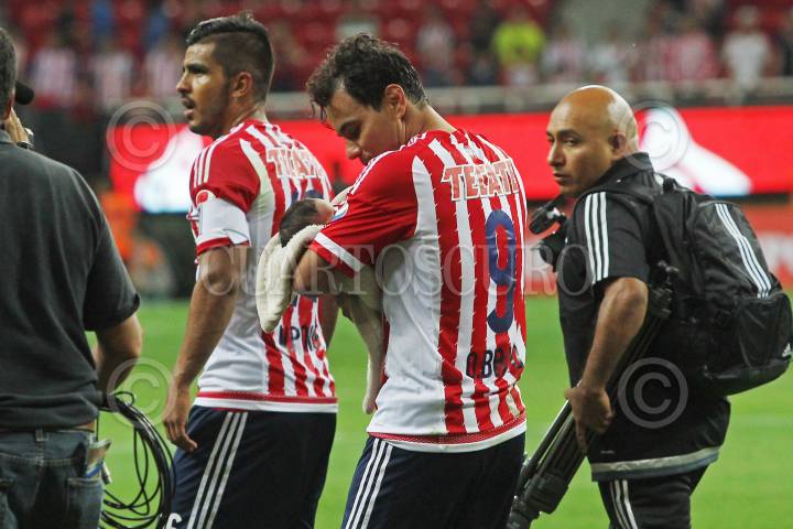 ZAPOPAN, JALISCO. 12AGOSTO2015.- El jugador de Chivas, Omar Bravo, quien hoy rompió la marca como el jugador de la historia del Guadalajara en marcar mas goles, celebra junto a su bebe recién nacido, esto en partido correspondiente a la Jornada 4 del Torneo Apertura 2015 de la Liga MX, en donde se enfrentan los equipos de las Chivas de Guadalajara frente a Monarcas Morelia, en partido que se lleva a cabo en el Estadio Omnilife. FOTO: FERNANDO CARRANZA GARCIA/ CUARTOSCURO.COM