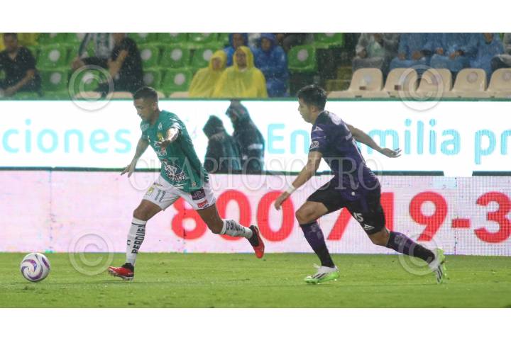 Elías Hernández (11) y Bryan Colula (15) durante el partido entre León y Mazatlán en el estadio León.