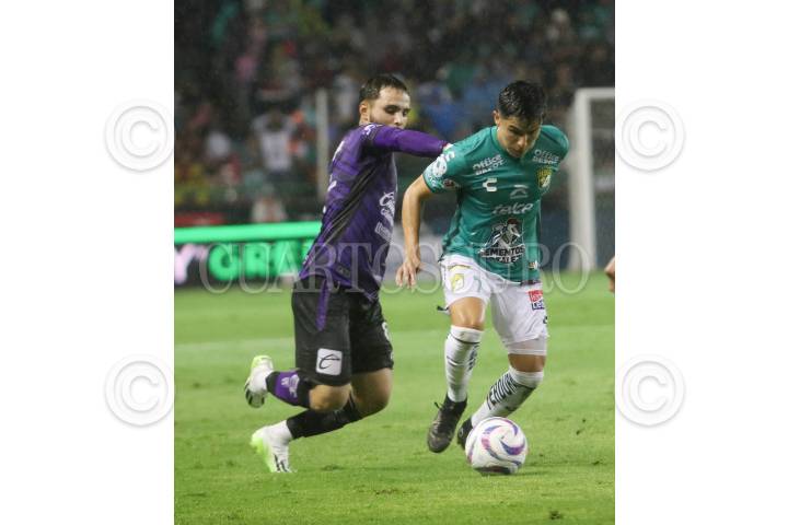 Josué Colmán (8) y Iván Moreno (7) durante el partido entre León y Mazatlán en el estadio León.