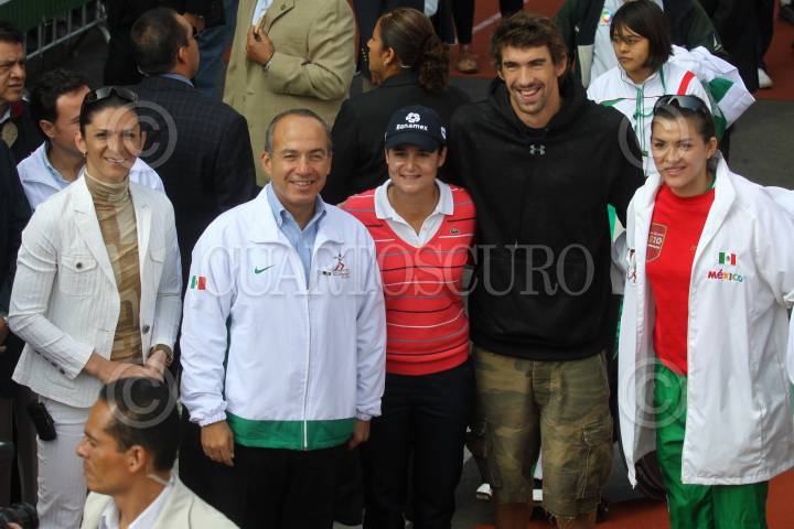MÉXICO, D.F., 09OCTUBRE2010.- El presidente Felipe Calderón acompañado de la velocista Ana Gabriela Guevara, la golfista Lorena Ochoa, el nadador estadounidense Michael Phelps y la taekwondoin María del Rosario Espinoza durante la inauguración del Festival Olímpico del Bicentenario que se realiza sobre el Paseo de la Reforma y en el que se presentarán atletas mexicanos. FOTO: RODOLFO ANGULO/CUARTOSCURO.COM