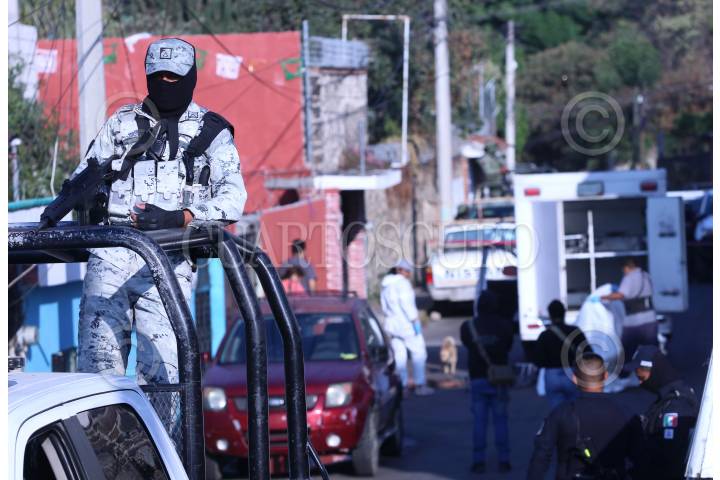 Un elemento de la Guardia Nacional resguarda la escena de un crimen en Cuernavaca, Morelos.