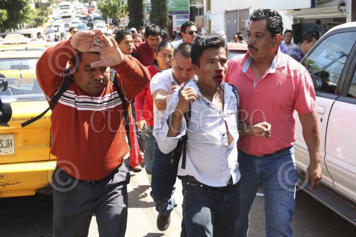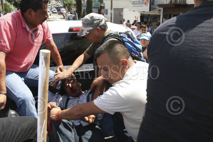 OAXACA, OAXACA, 04FEBRERO2015.-Profesores de la sección 22 de la CNTE se agarraron a golpes con maestros de la sección 59 del SNTE en la calzada Porfirio Díaz de la ciudad de Oaxaca. Los maestros de la S-59 protestaban contra su dirigente cuando los mentores disidentes arribaron y pretendieron llevar a Humberto Alcalá Betanzos, secretario de Organización de la 59 al zócalo para que firmara la entrega de los módulos irregulares y escuelas. Tras un golpe que descalabró a un dirigente de la 22, los profesores golpearon a un militante de la sección 59 a quien retuvieron y más tarde liberaron. FOTO: ARTURO PÉREZ ALFONSO /CUARTOSCURO.COM