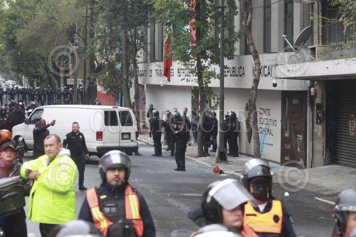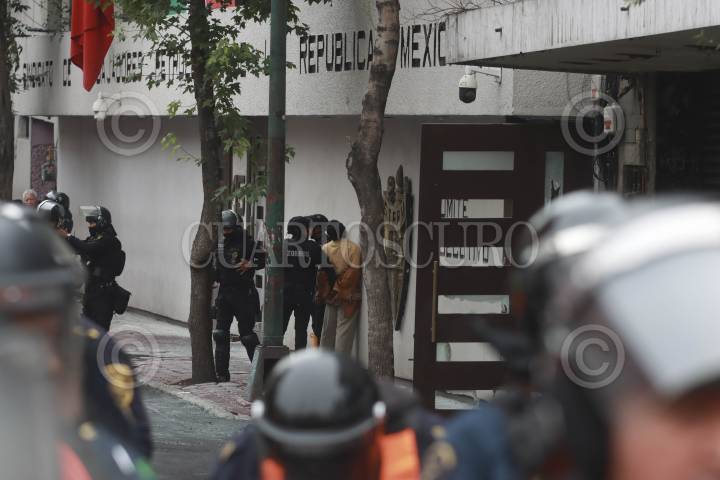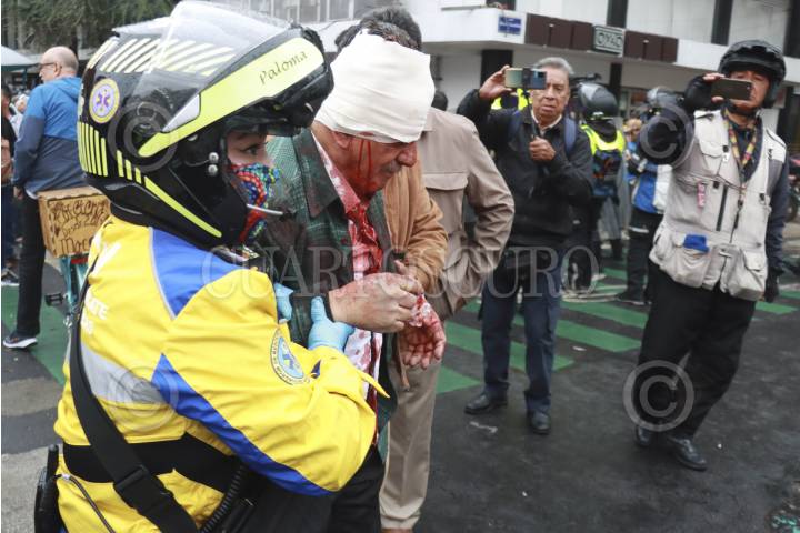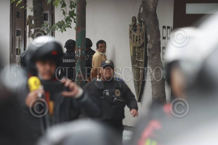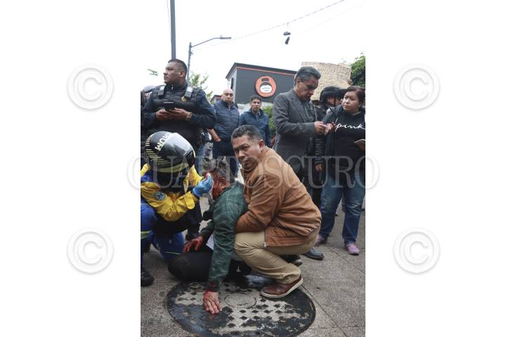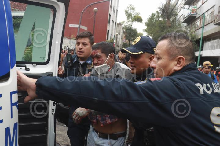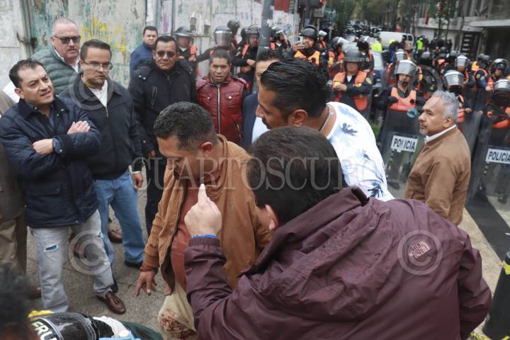 CIUDAD DE MÉXICO, 26SEPTIEMBRE2024.- El líder petrolero Rubén Choreño y algunos allegados fueron golpeados por individuos encapuchados que llegaron a la sede del Sindicato de Trabajadores Petroleros de la República Mexicana, cuando este se encontraba en las instalaciones para hacer válida una supuesta toma de nota que le había otorgado un juez y así poder asumir la Secretaría General del STPRM, la cual esta encabezada en estos momentos por Ricardo Aldana. Otras versiones señalan que fue Choreño Morales quien llegó con un grupo de personas para querer tomar las instalaciones del sindicato de manera violenta y fueron repelidos por quienes estaban en ese momento en inmueble. El líder petrolero (camisa verde) fue severamente golpeado y atendido por miembros del ERUM. Granaderos arribaron al lugar para intermediar en el conflicto, algunos de los que intentaron tomar esta sede fueron detenidos. FOTO: ROGELIO MORALES/CUARTOSCURO.COM
