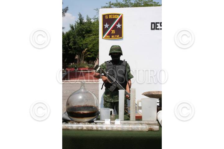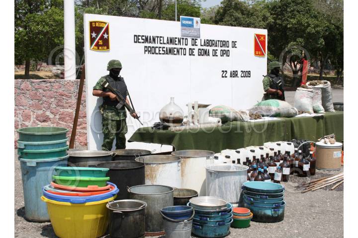 CHILPANCINGO, GUERRERO, 23ABRIL2009.- Elementos del Ejercito Mexicano llevaron a cabo la presentacion en las instalaciones de la 35 zona militar la "Desmantelacion de un Laboratorio de Procesamiento de Goma de Opio" que llevaron a cabo en el municipio de Heliodoro Castillo (Tlacotepec) durante un operativo que llevaron a cabo en dicha zona de la sierra del estado de Guerrero, donde lograron el decomiso de 205 kilogramos de opio aproximadamente, 3 gatos hidraulicos, 5 frascos de metil etil cetona, 3 frascos de acido hidroclorhidrico, un mini tambo de carbonato de sodio Anhidro, 6 garrafas con liquido fuerte, 29 frascos de diferentes sustancias quimicas (vacios), 5 bidones de plastico con capacidad para 200 litros (vacios), 6 vaporeras, 7 tinas de plastico, una bascula, una prensa metalica, un rollo de bolsa de polietileno, un envoltorio que en su interior contiene polvo blanco que despide un olor fuerte (sales de amonio), una cacerola con liquido oscuro y viscoso al parecer residuos de goma de opio (esterato de butilo). FOTO: OSCAR ALVARADO/CUARTOSCURO.COM