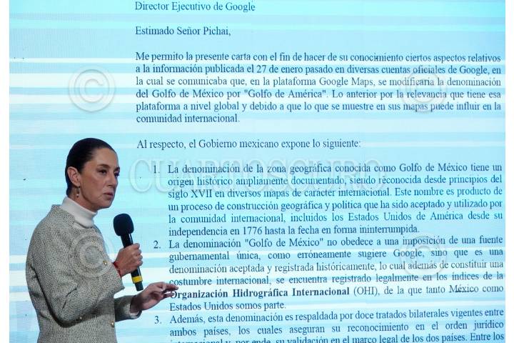 CIUDAD DE MÉXICO, 17FEBRERO2025.- Claudia Sheinbaum, Presidenta de México, muestra la carta que Google le mando tras pronunciarse sobre el cambio en sus mapas de Golfo de México por Golfo de América, esto tras el decreto de Donald Trump, quien al asumir su Presidencia firmo un decreto para hacer este cambio. La Jefa del Ejecutivo insistió que el decreto solo aplica a la zona marítima de las costas de Estados Unidos y no los territorios de México y Cuba, por lo que el canciller mexicano volvió a mandar otra carta para que Google precise este dato. FOTO: MOISÉS PABLO/CUARTOSCURO.COM