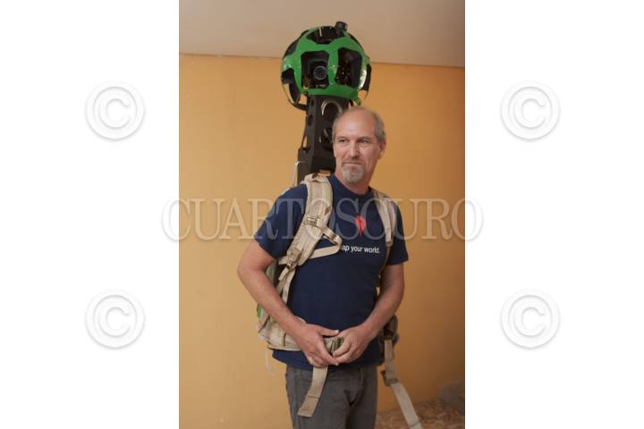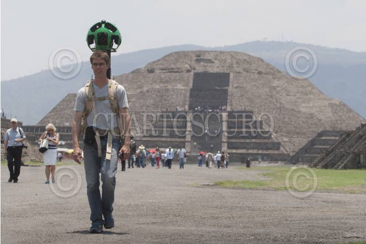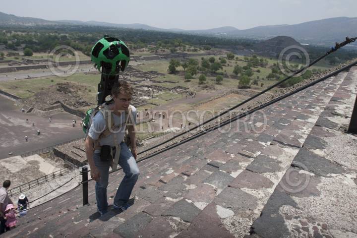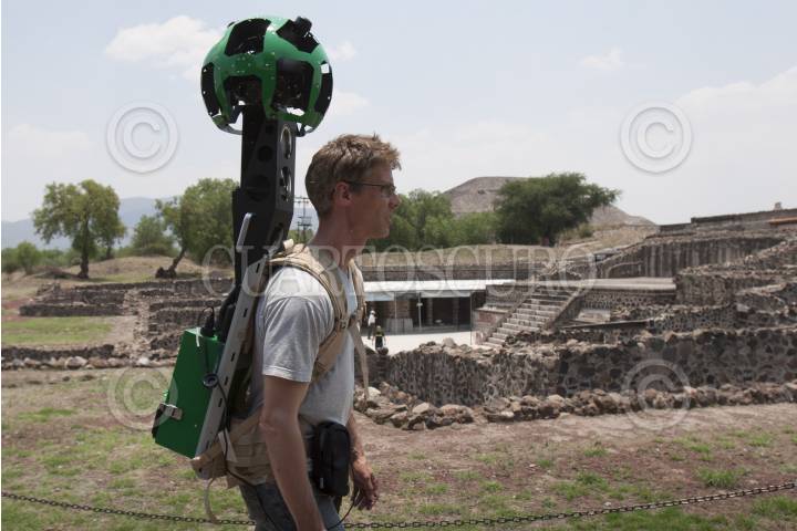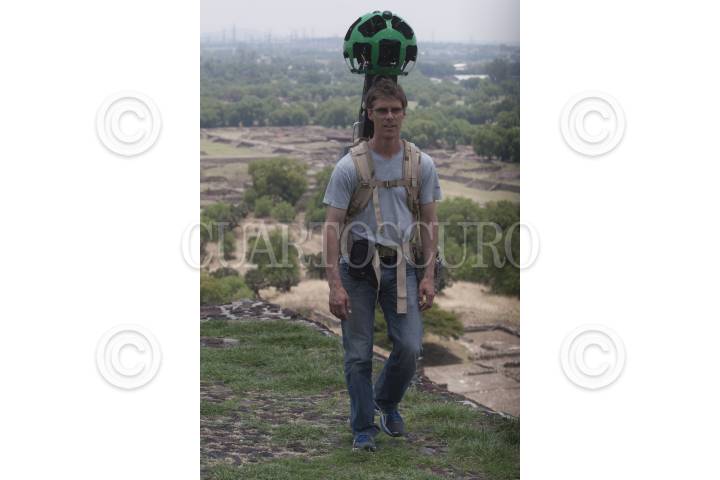 TEOTIHUACÁN, ESTADO DE MÉXICO 22MAYO2013.- El líder de desarrollo tecnológico para Street View de Google, Daniel Filip, carga una cámara de 360 grados de alta definición con 15 lentes. Google en conjunto con el Instituto Nacional de Antropología e Historia (INAH) presentaron ese equipo denominado Trekker, que poseé también un disco duro, dos antenas GPS, y un dispositivo movil. Con un peso aproximado de 19 kilos, con el cual se realizó la captura de las imágenes de las Pirámides de Teotihuacan, sin dañar el patrimonio histórico. Estas imágenes serán las primeras que se subirán al servicio Street View a finales de año. La firma ya tiene recorridos virtuales en 34 zonas arqueológicas en el país, pero esta es la primera vez que se realiza con este equipo en una piramide a nivel mundial. FOTO: JUAN PABLO ZAMORA /CUARTOSCURO.COM