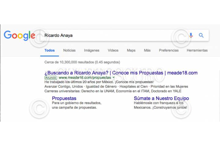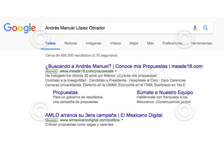 CIUDAD DE MÉXICO, 01ABRIL2018.- Usuarios del buscador Google señalaron que al rastrear información de los candidatos a la Presidencia de la República; Margarita Zavala, Ricardo Anaya y Andrés Manuel López Obrador, los primeros resultados que aparecen son tres opciones que te llevan a un sitio oficial con las propuestas de campaña del priista José Antonio Meade. Los resultados de búsqueda se destacan con la palabra "anuncio" y se pueden desactivar, pero aparecen como primera opción de búsqueda. En el caso de Andrés Manuel López Obrador, sucede con el acrónimo AMLO e incluso el seudónimo "peje". FOTO: CUARTOSCURO.COM