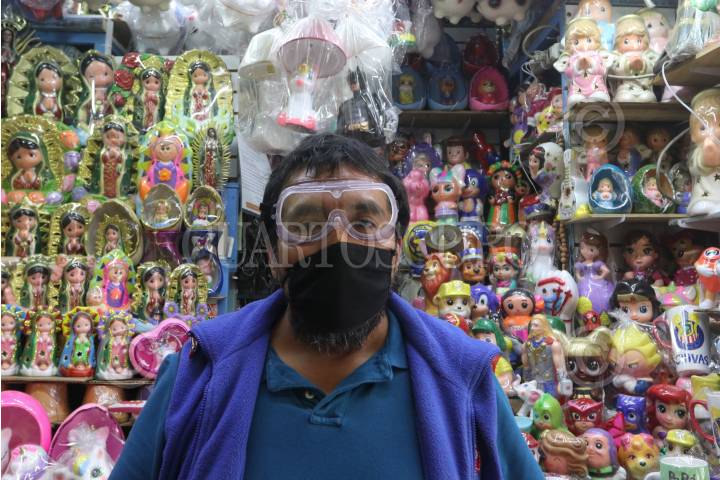 Un locatario del Mercado Sonora utiliza cubrebocas y googles como medidas de prevención del contagio del Covid-19