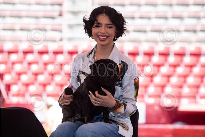 Ángela Aguilar muestra a su mascota "Gordo" durante la conferencia de prensa en la que se anuncio el espectáculo "Jaripeo sin fronteras", en La México.