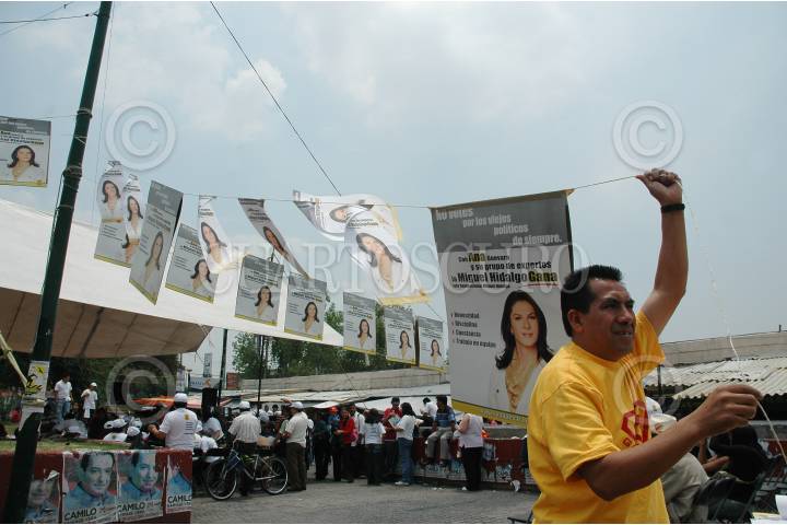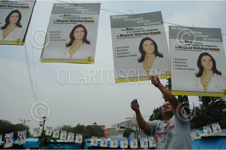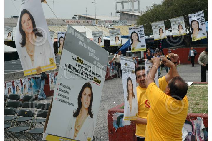 MÉXICO, D.F., 30MAYO2009.- Organizadores del evento en apoyo a la candidata perredista Ana Gabriela Guevara, que contiende para jefa delegacional de Miguel Hidalgo, colocan carteles con la imagen de la ex-velocista en la explanada del mercado de Tacuba en donde se realizó el mitin. FOTO: MOISÉS PABLO/CUARTOSCURO.COM