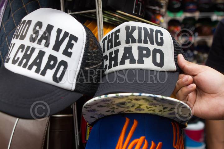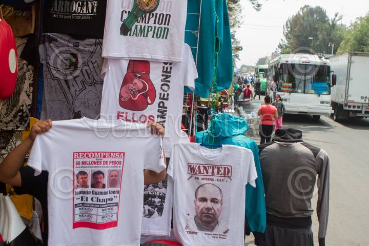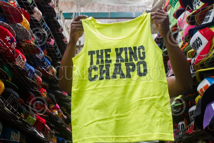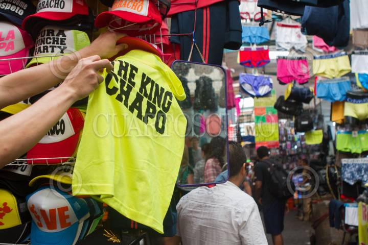 MÉXICO, D.F., 23JULIO2015.- Comerciantes del barrio Tepito ofertan playeras, sudaderas y gorras alusivas a Joaquín Loera "El Chapo" Guzmán, el capo de Sinaloa, quien fue noticia este mes tras su fuga del penal del Altiplano, los vendedores reportan una gran demanda de este tipo de productos que van de los cincuentas pesos hasta los $150. FOTO: MOISÉS PABLO /CUARTOSCURO.COM