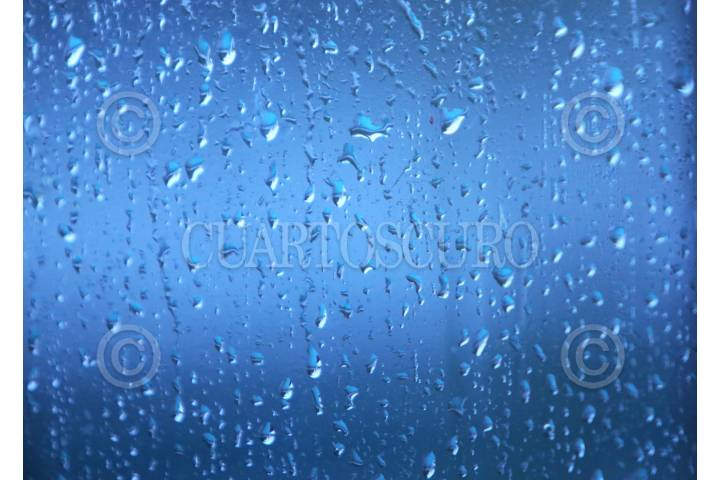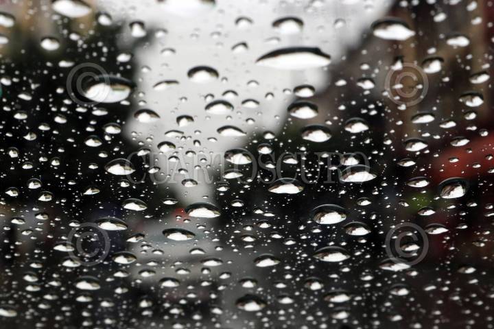 Después de una lluvia matinal decenas de gotas de agua resbalan en un parabrisas.