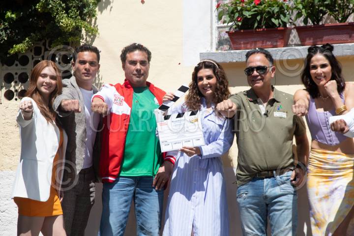 Daniela Martínez, Carlos Sid, Eduardo Yáñez, Mayrin Villanueva, Nicandro Díaz y Eva Cedeño durante el pizarrazo por inicio de grabación de la telenovela "Golpe de suerte", en calles de la colonia Molino de Rosas.