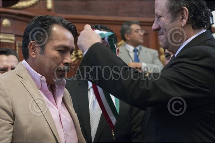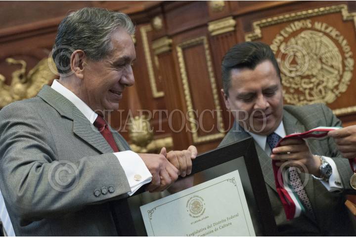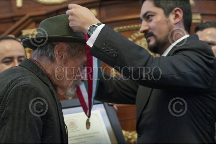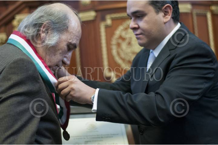 MÉXICO, D.F., 30OCTUBRE2014.- El muralista Antonio González Orozco recibe la medalla al Mérito en Artes 2013 que otorgó la Asamblea Legislativa del Distrito Federal (ALDF) durante la sesión solemne de hoy. FOTO: DIEGO SIMÓN SÁNCHEZ /CUARTOSCURO.COM