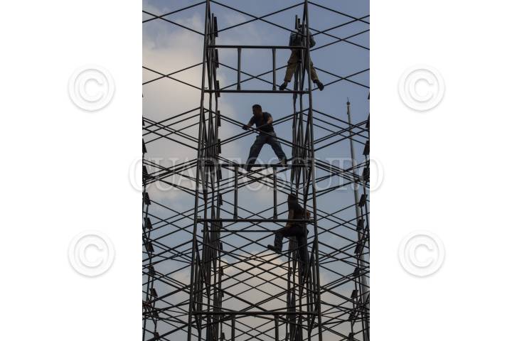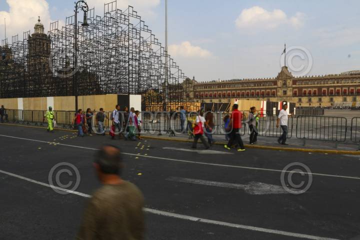 MEXICO, D.F, 15NOVIEMBRE2014.- Trabajdores ya colocan gradas en la explanada del zócalo capitalino para el desfile por los fetejos del aniversario 104 de la Revolución Mexicana. FOTO: DAVID POLO /CUARTOSCURO.COM