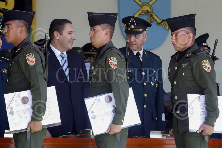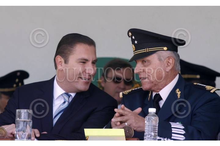 PUEBLA, PUEBLA, 10JULIO2014.- El secretario de la defensa nacional (SEDENA), Salvador Cienfuegos, y el gobernador de Puebla, Rafael Moreno Valle Rosas, encabezaron la ceremonia de graduación de la Escuela Militar de Sargentos de Primera Antigüedad 2014, que se llevó a cabo en las instalaciones de la XXV Zona Militar de Puebla. FOTO: HILDA RÍOS/ CUARTOSCURO.COM