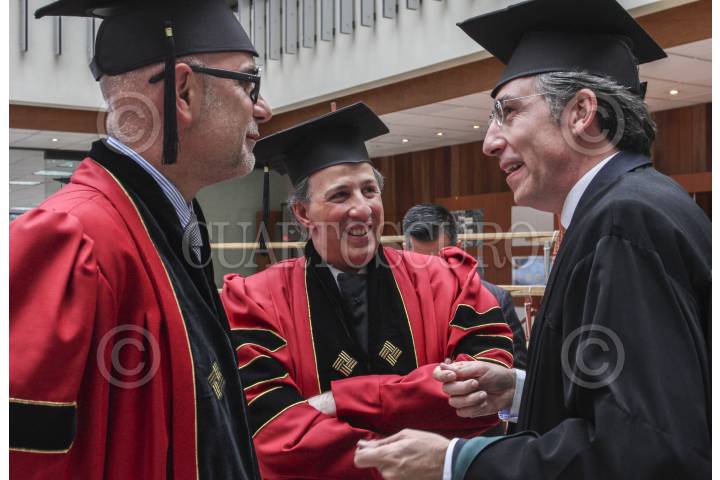 MÉXICO, D.F., 10OCTUBRE2015.- José Antonio Meade, secretario de Desarrollo Social, acudió como invitado de honor a la graduación de más de 200 alumnos de la Universidad Anáhuac, de la cual el secretario también es graduado. Al final de la cermonia recibió un reconocimiento por parte de las autoridades de la institución educativa. En la imagen, Jorge Vázquez del Mercado, director de la carrera de Arquitectura en la Anáhuac, José Antonio Meade, secretario de Desarrollo Social, y Alfredo Nava, director de Anáhuac en Línea. FOTO: MARÍA JOSÉ MARTÍNEZ /CUARTOSCURO.COM