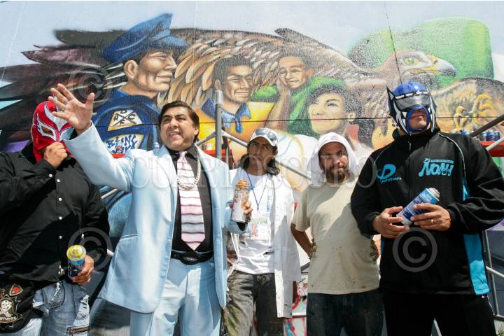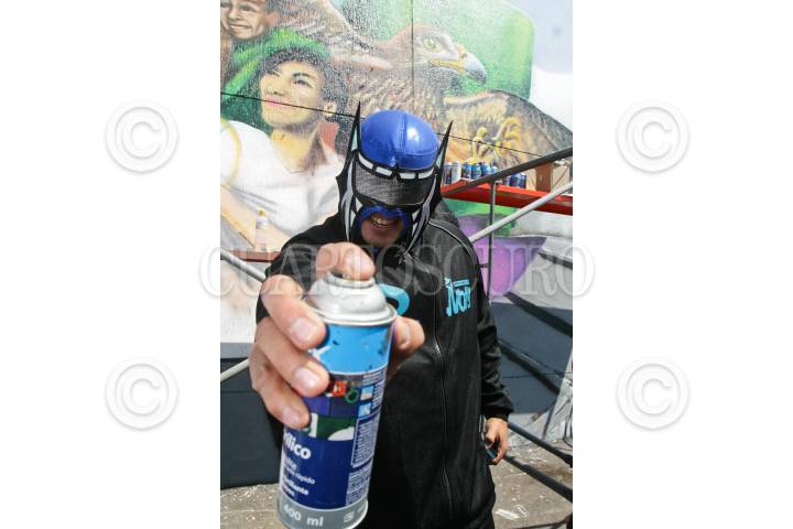 MÉXICO, D.F., 15FEBRERO2009.- El luchador Abismo Negro visitó el estacionamiento del Estadio Azteca, donde cientos de jóvenes participan en el Segundo Megaconcurso de Graffiti, organizado por autoridades del gobierno del Distrito Federal. FOTO: ISAAC ESQUIVEL/CUARTOSCURO.COM