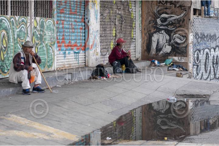 MÉXICO, D.F., 10JUNIO2014.- Dos hombres descansan sobre la banqueta de Eje Central entre muros y cortinas llenos de graffitis. FOTO: DIEGO SIMÓN SÁNCHEZ /CUARTOSCURO.COM