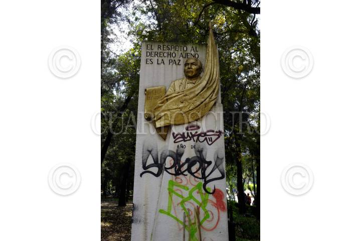 08NOVIEMBRE2014.- "El respeto al derecho ajeno es la Paz" dijo el Presidente Benito Juarez. En el parque que lleva el nombre del poeta Zacatecano Ramón López Velarde, Antonio M. Anza, Av. Cuauhtémoc y Huatabampo de la colonia Roma. En el busto de El Benemérito de las Américas, D.F., entre las calles Orizaba, frente al Centro Médico Siglo XXI, se encuentra este sábado así. FOTO: PEDRO VALTIERRA /CUARTOSCURO.COM