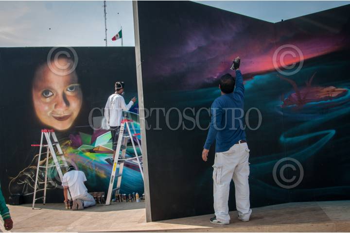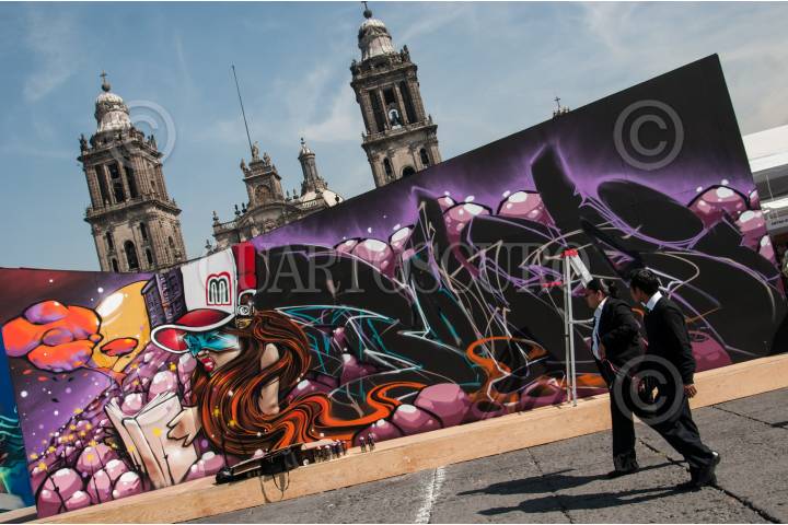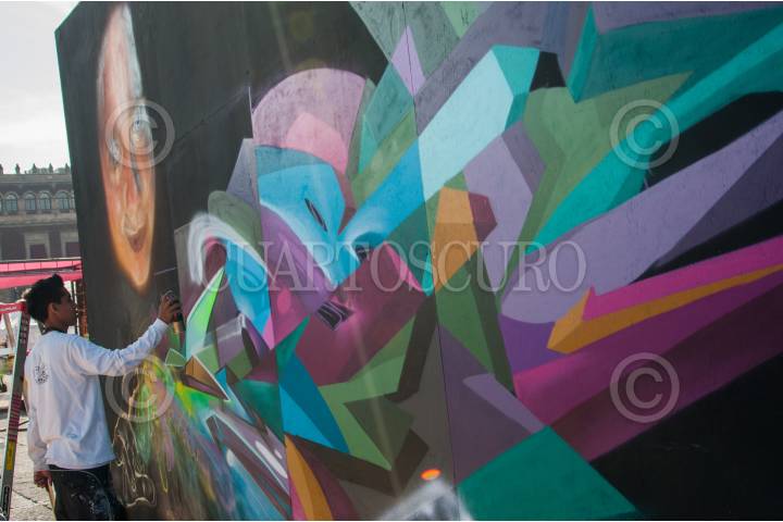 MÉXICO, D.F., 13OCTUBRE2015.- Como una forma de alejar a los jóvenes del graffiti vandálico y brindarles espacios de expresión, la plancha del zócalo capitalino es sede de las actividades del Festival Internacional “Meeting of Styles” 2015 en el cual artistas urbanos de distintas nacionalidades plasman sus propuestas de murales con aerosol. En el marco de las actividades de la Feria Internacional del Libro en el zócalo los graffitis tienen la temática de lectura en jóvenes. FOTO: DIEGO SIMÓN SÁNCHEZ /CUARTOSCURO.COM