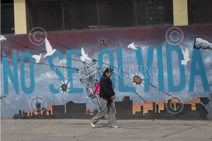 MÉXICO, D.F., 28DICIEMBRE2015.- Una mujer camina sobre la avenida Flores Magón en donde se lee una pinta en un muro "No se olvida", en referencia a la matanza de 1968. Aunque la frase esta muy ha doc para estos últimos días del año. FOTO: MOISÉS PABLO /CUARTOSCURO.COM