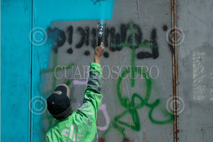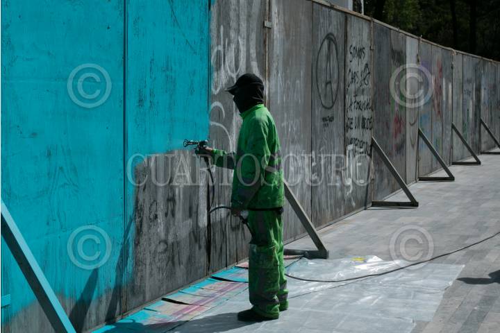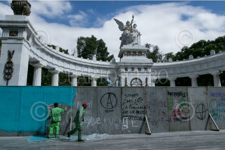 Trabajadores pintan las vallas que protegen al Hemiciclo a Juárez. FOTO: GALO CAÑAS/CUARTOSCURO.COM
