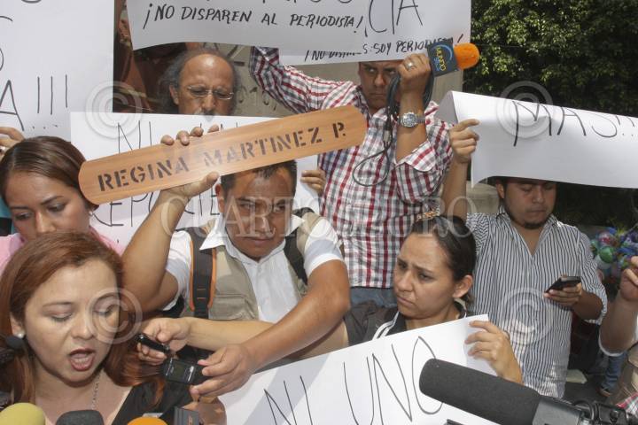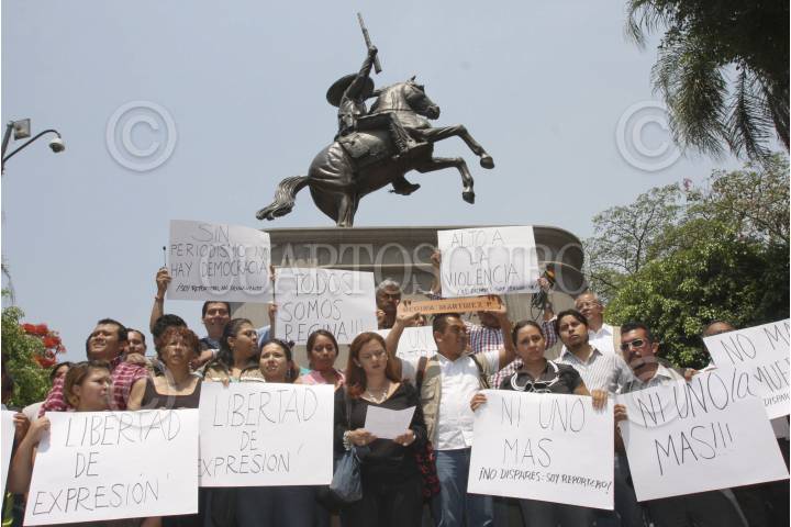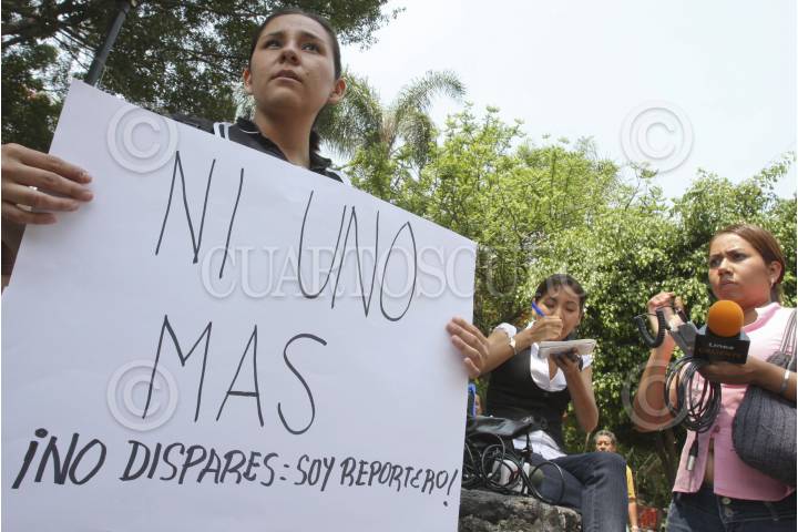 CUERNAVACA, MORELOS, 04MAYO2012.- Periodistas, camarógrafos y fotógrafos del estado de Morelos se manifestaron en la plaza de armas de Cuernavaca, en demanda de protocolos de seguridad y en memoria de los reporteros asesinados recientemente en Veracruz. Posteriormente dejaron una ofrenda frente el Palacio de Gobierno donde se reunieron con representantes del Secretario de Gobierno. FOTOS: ALMA LAFAYET /CUARTOSCURO.COM